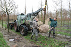 De boomkwekerij kent twee werkpieken. Het voorjaar, wanneer al het groen op het terrein verzorgd moet worden. En de periode december tot eind april, wanneer de bomen geen blad meer hebben en ze geschikt zijn om te vervoeren naar de klant. Smarius: ‘De bomen zijn dan in rust en kunnen verplant worden. We halen ze uit de grond, takelen ze met een kraan omhoog en verpakken de kluiten. Vervolgens laden we de bomen van bovenaf in een lange trailer. We letten goed op dat er tijdens het rooien, opbinden en laden geen takken breken.’